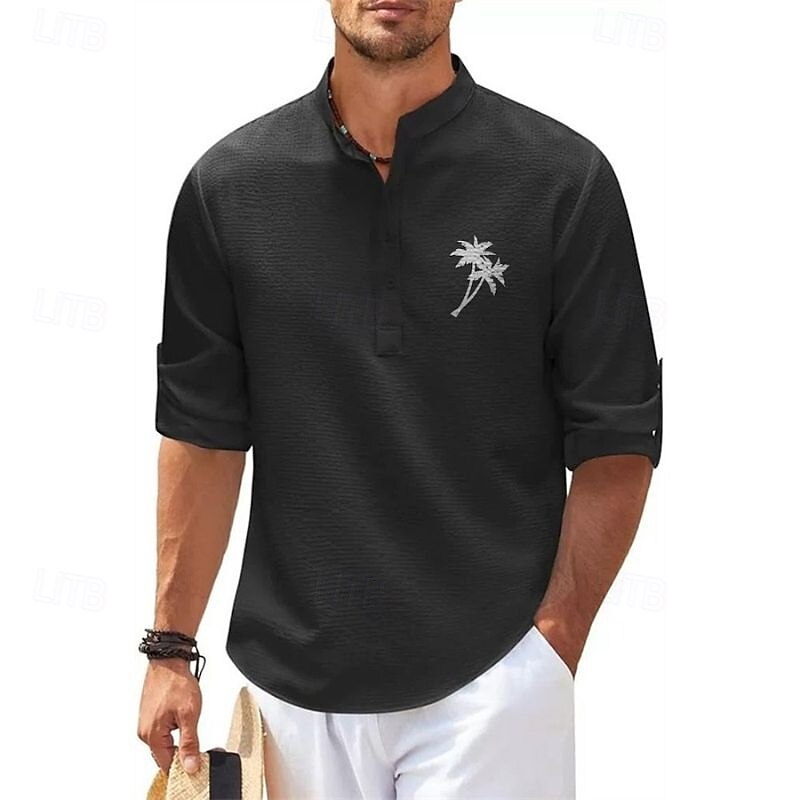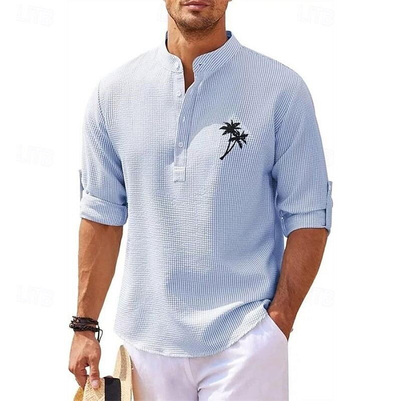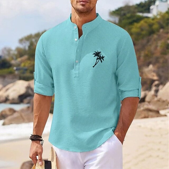 More information about Men's Minimalist Aloha Shirt Popover Shirt Summer Shirt Casual Shirt Beach Shirt Waffle Knit Shirt Black White Blue Sky Blue Dark Gray Long Sleeve Coconut Tree Classic Stand Collar Henley Vacation