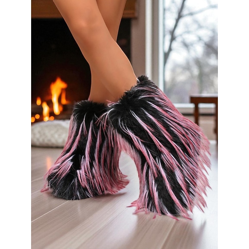 Women's Fashion Furry Platform Boots - Pink and Black Fluffy Statement Footwear for Street Style, Winter Outfits, Rave Looks and Trendy Festival Wear 2