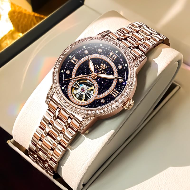HOT ! OLEVS Women’s Watch Automatic Diamond Tourbillon Luxury Fashion Stainless Steel Waterproof Luminous Wrist Watches for Ladies Gift Rose Gold/Starry Sky Blue/Silver