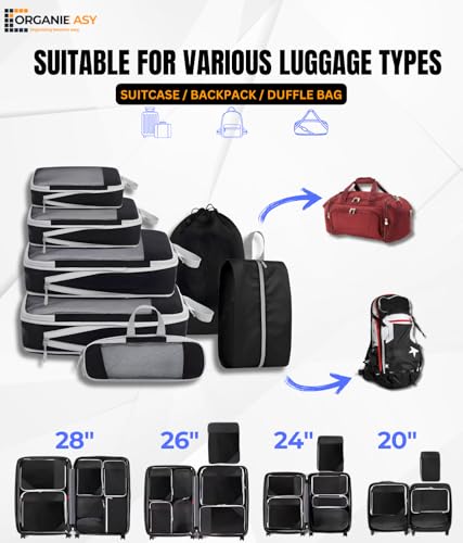 • ● Space-Saving Compression Technology: Maximize luggage capacity with the double-zipper compression feature. Our Packing Cube easily compresses bulky items, such as sweaters or jackets, without wrinkling them, leaving more room for souvenirs and essentials. Packing cube set has a dedicated shoe organizer which protects your shoes and keeps them separate from your clean clothes with the included shoe cube.