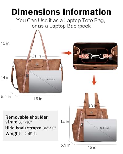 • Size: Expansion xl laptop tote bag size: 21"top-15"bottom W * 5.5"D * 14"H, folding as a laptop backpack size: 13" top-15"bottom W * 5.5"D * 14"H, portable height:12", Removable strap length: 37"-48", weighs 2.49 lb, and can easily accommodate laptop under 15.6 inches, it is a stylish travel tote laptop bag