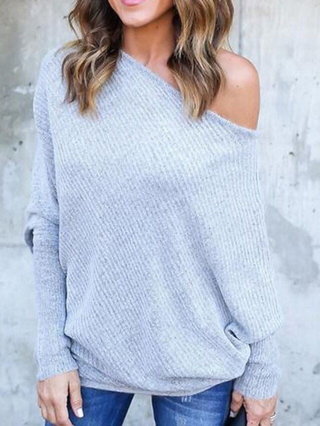 Women's Sweater Pullover Fashion Soft Solid Color Ribbed Off Shoulder Knitted Long Sleeve Regular Tops Knit Outdoor Daily Going out Wine Red Black Fall 10