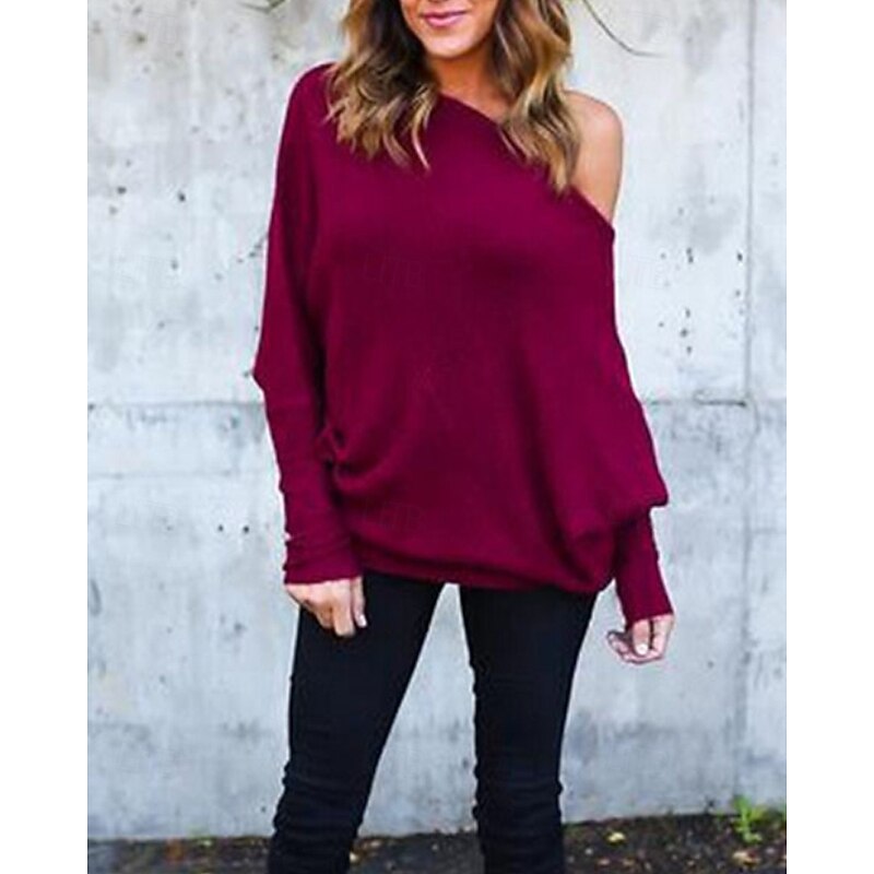 Women's Sweater Pullover Fashion Soft Solid Color Ribbed Off Shoulder Knitted Long Sleeve Regular Tops Knit Outdoor Daily Going out Wine Red Black Fall 8