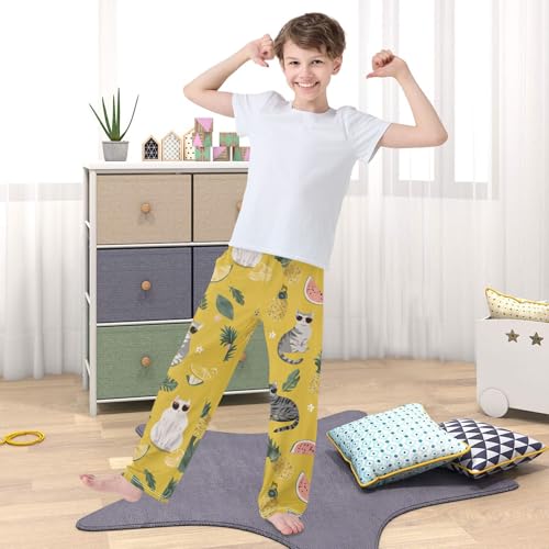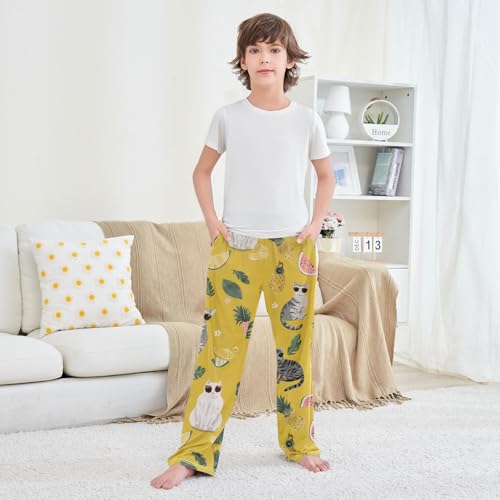 HOT ! Tropical Cat Pineapple Boys Long Pants Soft Trousers Elastic Waist Kids Lounge Bottoms with Pockets S-XL
