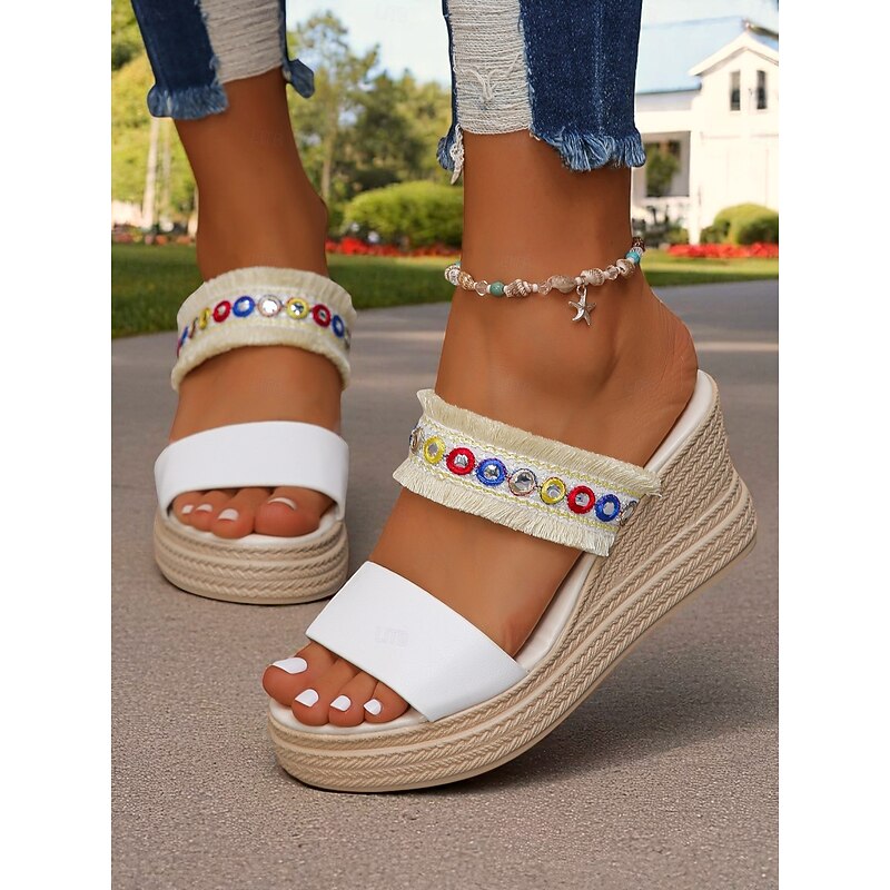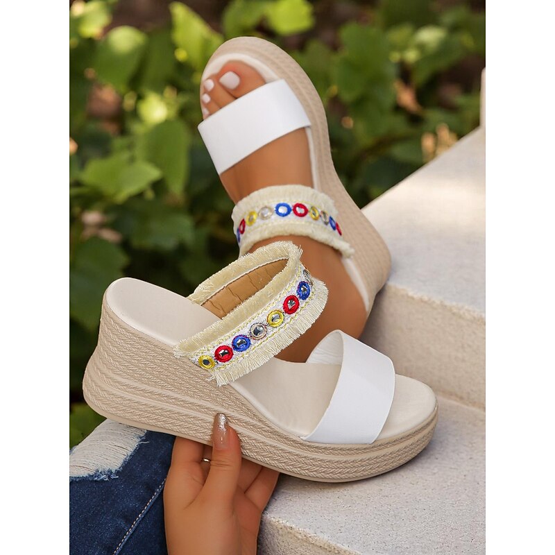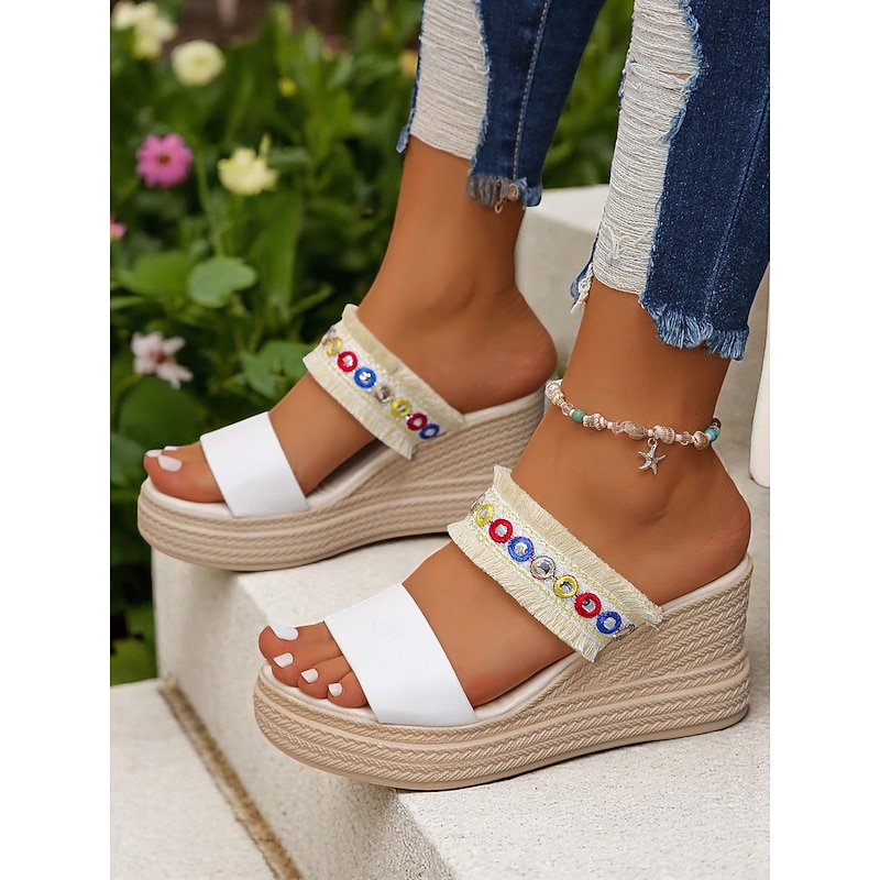 HOT ! Women's White Platform Slide Sandals with Colorful Beaded Fringe Straps, Boho Chic Wedge Shoes for Casual Summer Outings and Beach Vacations