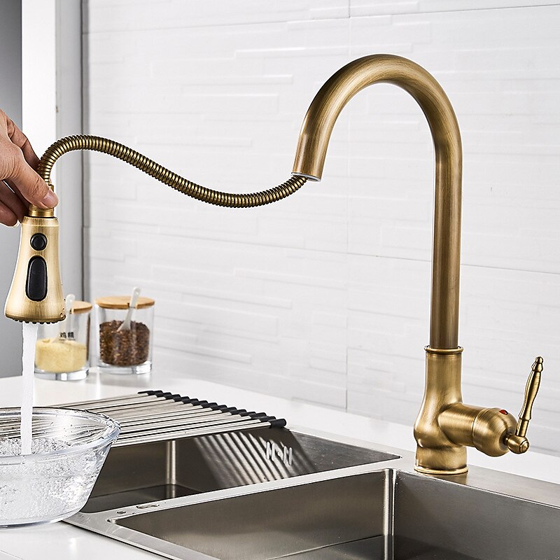 HOT ! Kitchen Faucet Pull Out Sink Mixer Taps, 360 Degree 2 Mode Sprayer, Vintage Brass Vessel Tap with Cold and Hot Hose