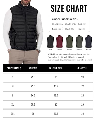 • Lightweight & Warm: Mens lightweight vest, It feels like wearing paper, very soft to the skin and touch. It is not extremely puffy, so it doesn't take up much space in your closet, and is easy to fold for traveling. Stand collar, elastic cuffs/hem help minimize heat loss and reduce cold air entry to keep warmth