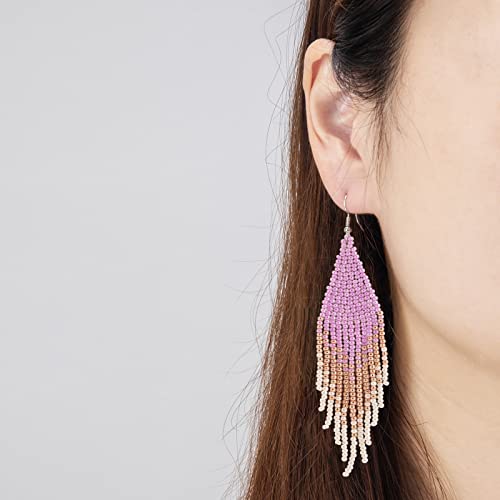 Native Beaded Tassel Earrings Boho - Handmade Seed Bead Statement Fringe Drop Earrings for Women Dangling 7