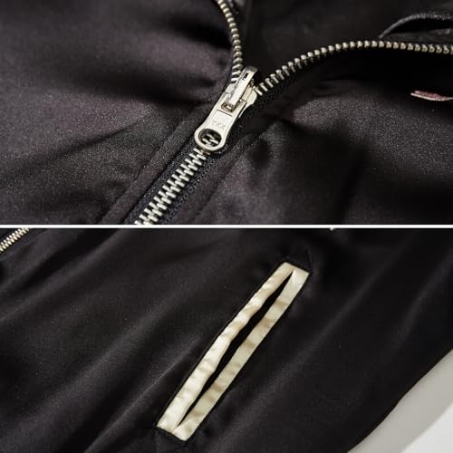 • High-Quality Material: The bomber jacket is made of heavyweight satin,which is cool and silky to the touch,and the high-density woven fabric is both soft and tear-resistant,not easy to snag,exuding luxury and retro charm under sunlight