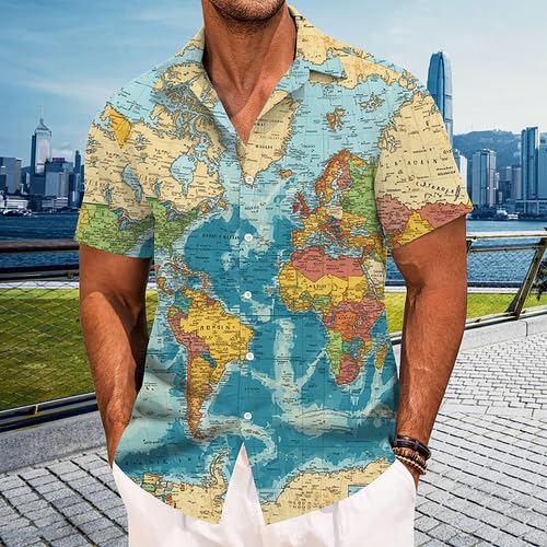 HOT ! Map Shirt,Men's Tropical Shirt World Map Print | Casual Vacation Beach Top Lapel Clothes for Dating Cruise Travel