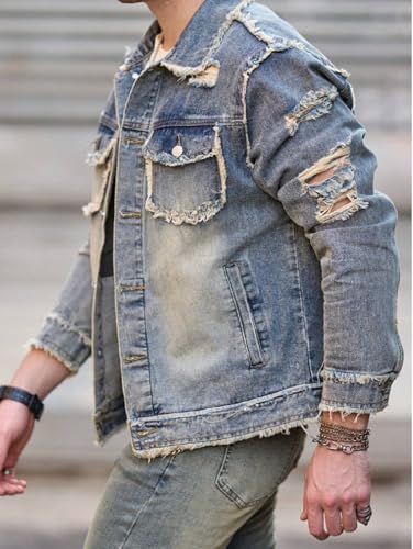 Huang's Men's Denim Jacket with Distressed Ripped Details Classic Fit Non - Stretch Fabric Cool Stylish Caual Coat 5