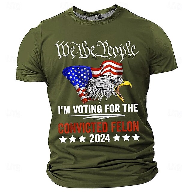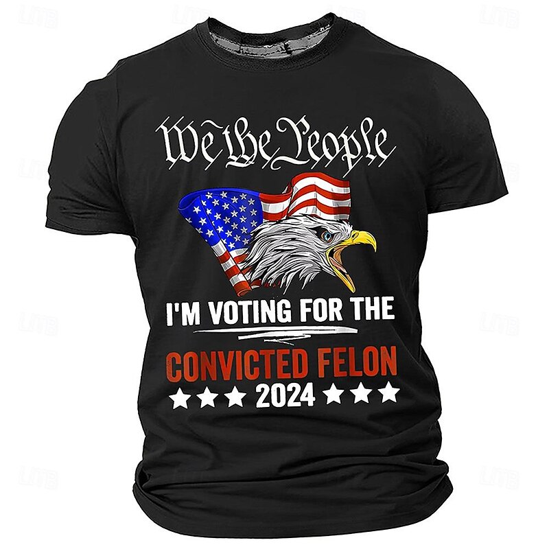 Highlights [Fabric] : Crafted from breathable polyester, this men's T-shirt offers a soft, stretchy fit, making it ideal for spring and summer wear. The material ensures comfort with its lightweight and airy properties, suitable for everyday activities. [Fit] : The shirt features a tailored fit with a classic crew neckline, providing a relaxed yet polished look. Its short sleeves make it perfect for casual occasions, enhancing comfort and style. [Design Highlights] : This T-shirt showcases a vibrant 3D print design, featuring the iconic American bald eagle adorned with a USA flag cap. The bold text "We the People" enhances the design, creating a statement piece that captures a retro and vintage vibe. [Occasions] : Perfect for streetwear, casual outings, or bar settings, this T-shirt suits various casual scenarios, offering political enthusiasts a stylish way to express their interests. [Size Range] : Available in a comprehensive size range from S to 3XL, this T-shirt caters to a wide audience, ensuring a comfortable fit for different body types.