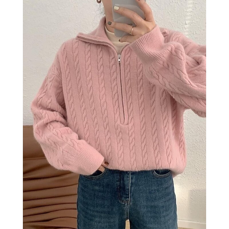 HOT ! Women's Sweater Fashion Casual Solid Color Ribbed Half Zip Knitted Long Sleeve Regular Tops Knit Outdoor Daily Weekend Pink Fall Winter