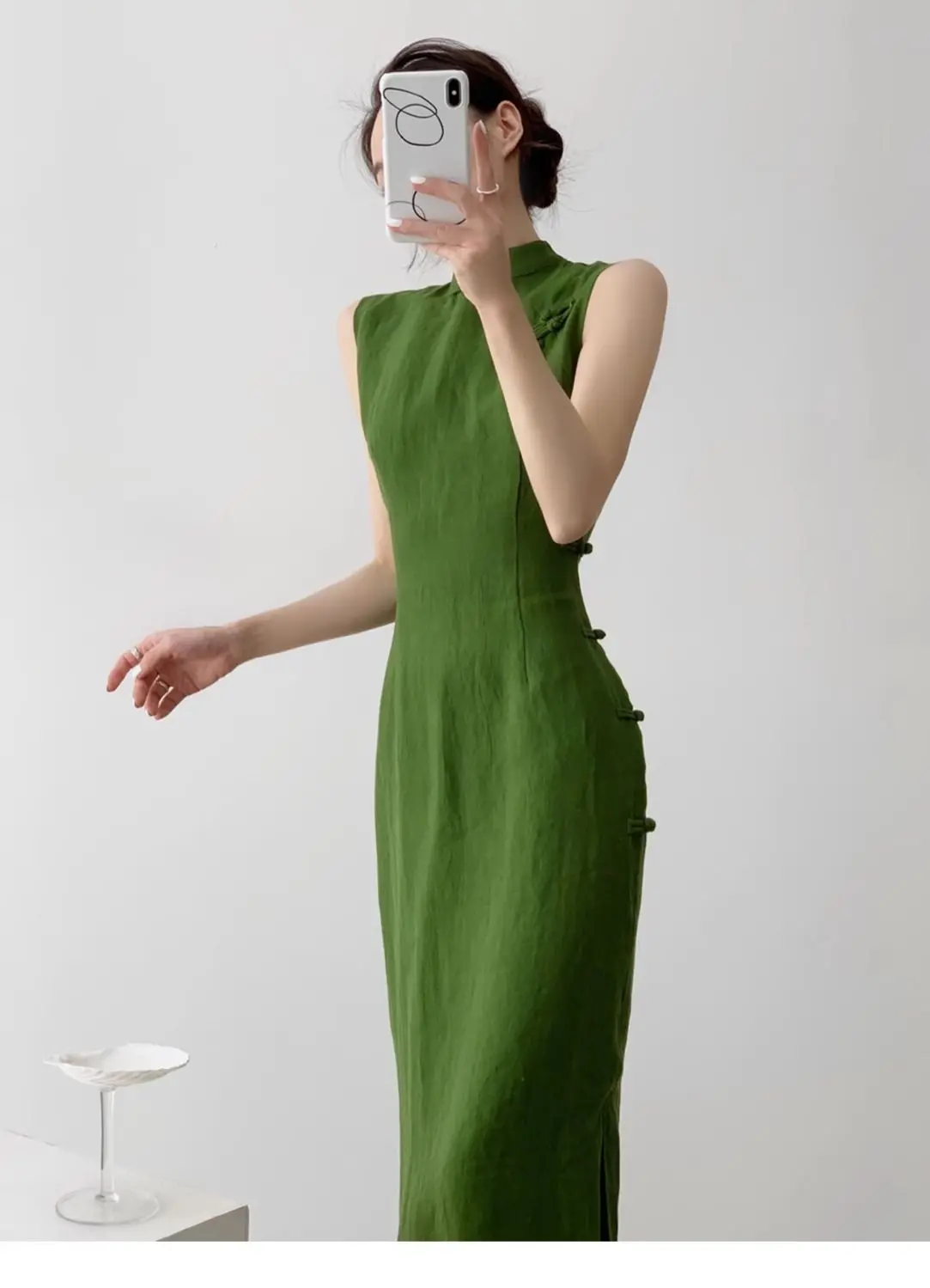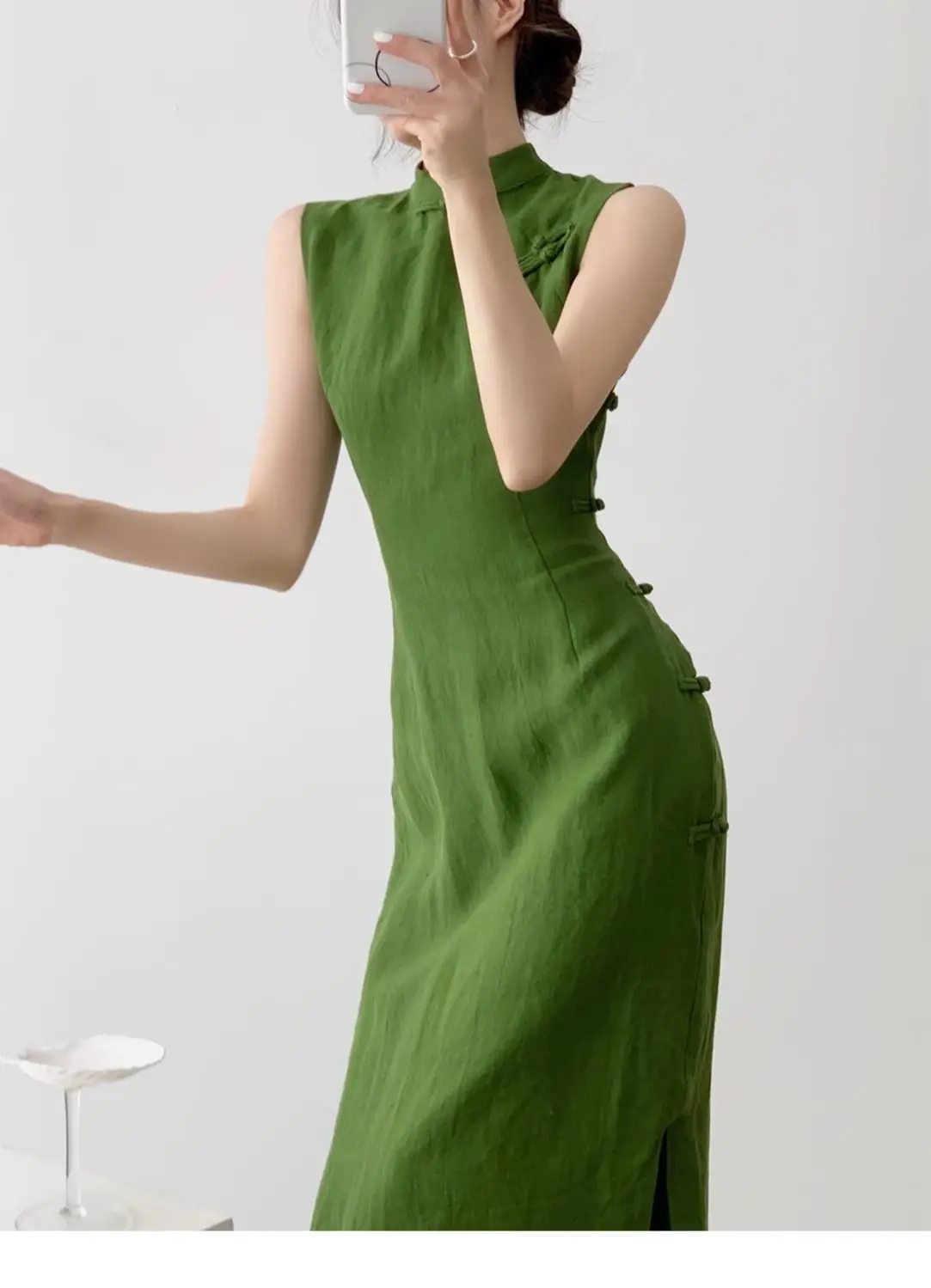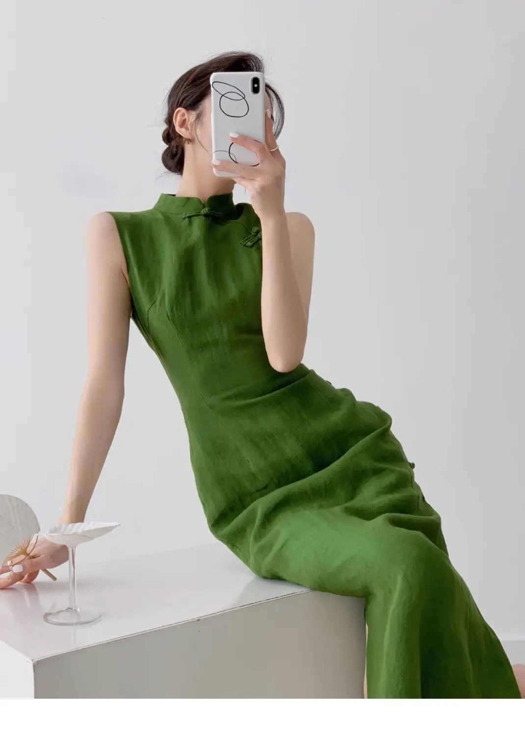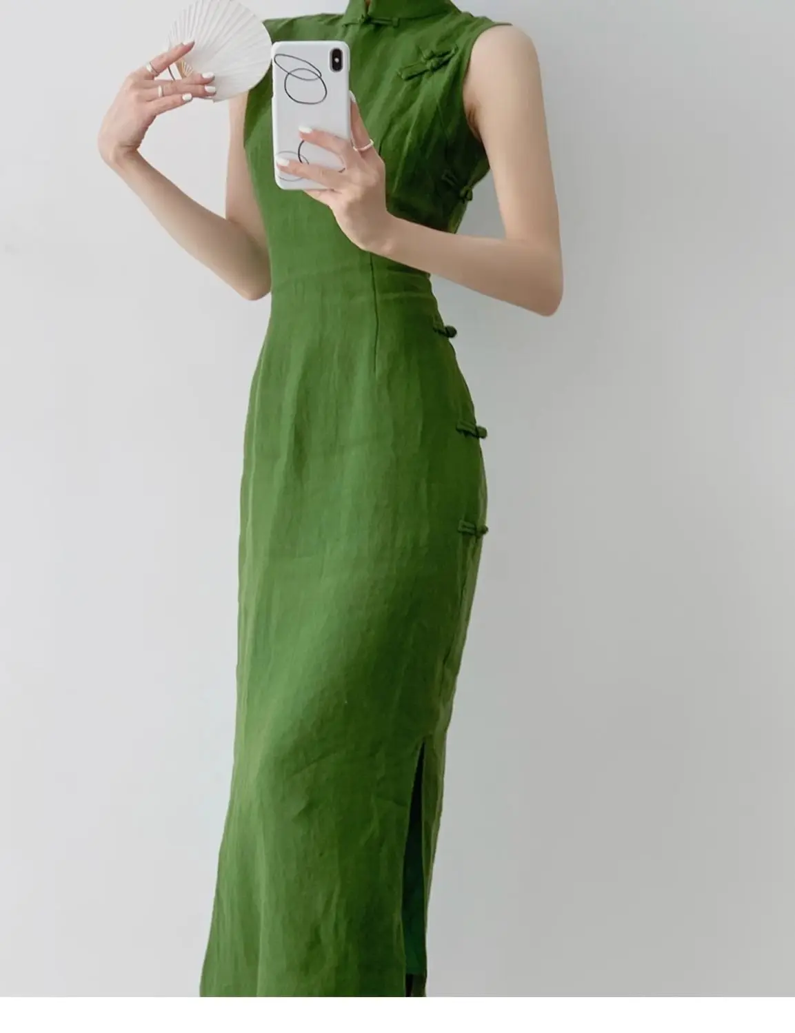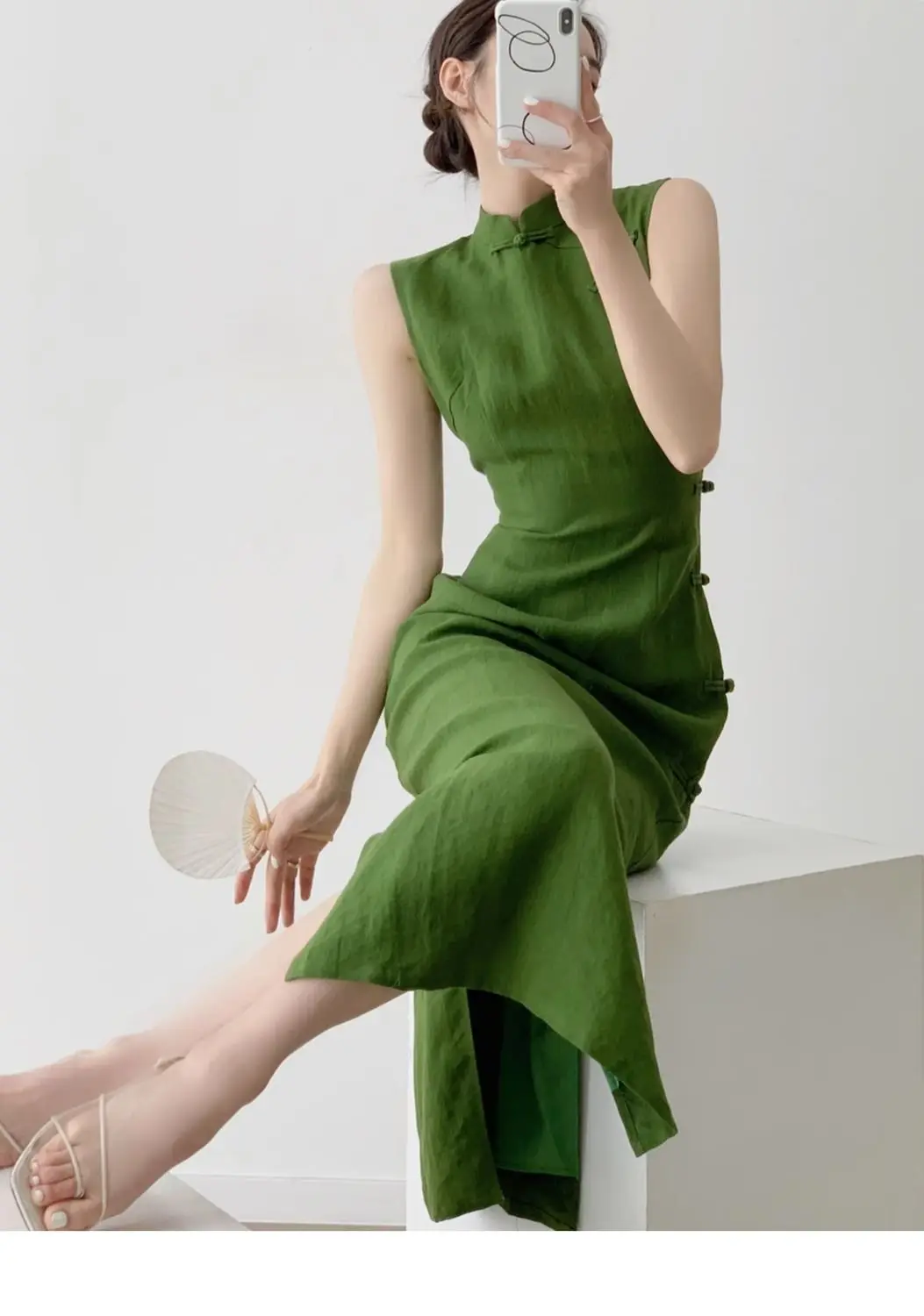 2025 vintage natural literature art dress chinese style daily improved leisure qipao sexy sleeveless waist cinching slit qipao