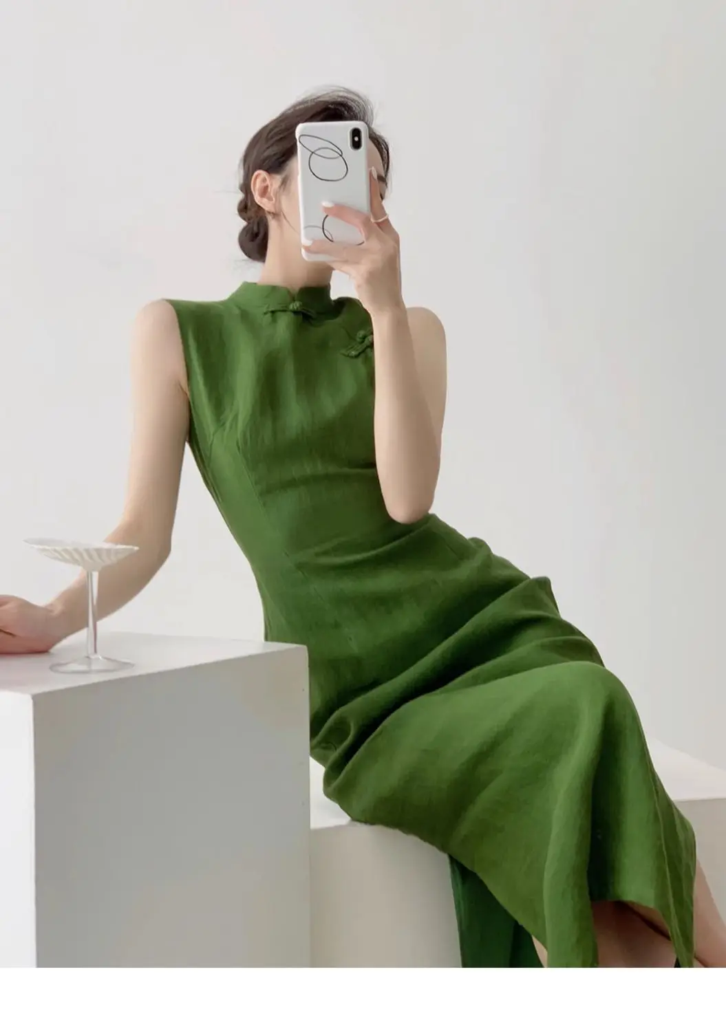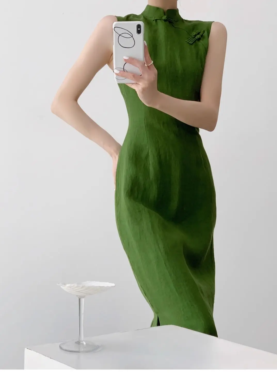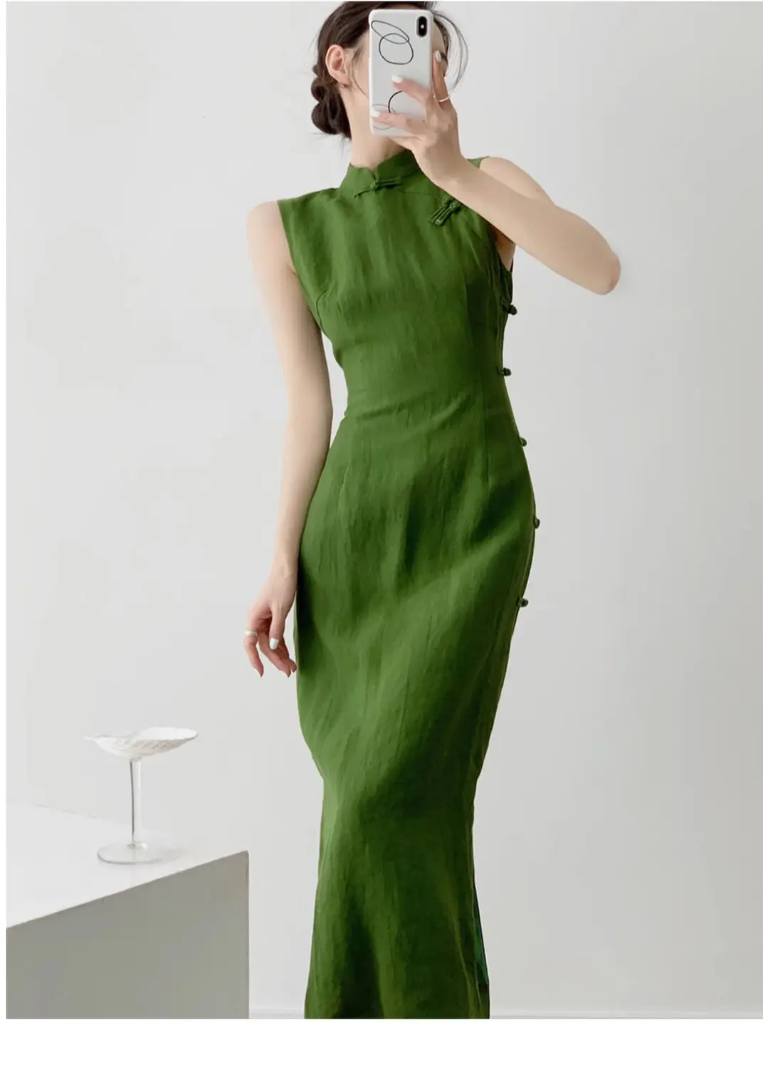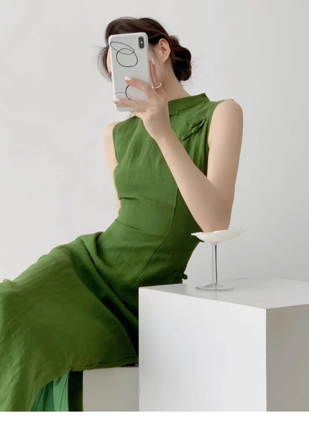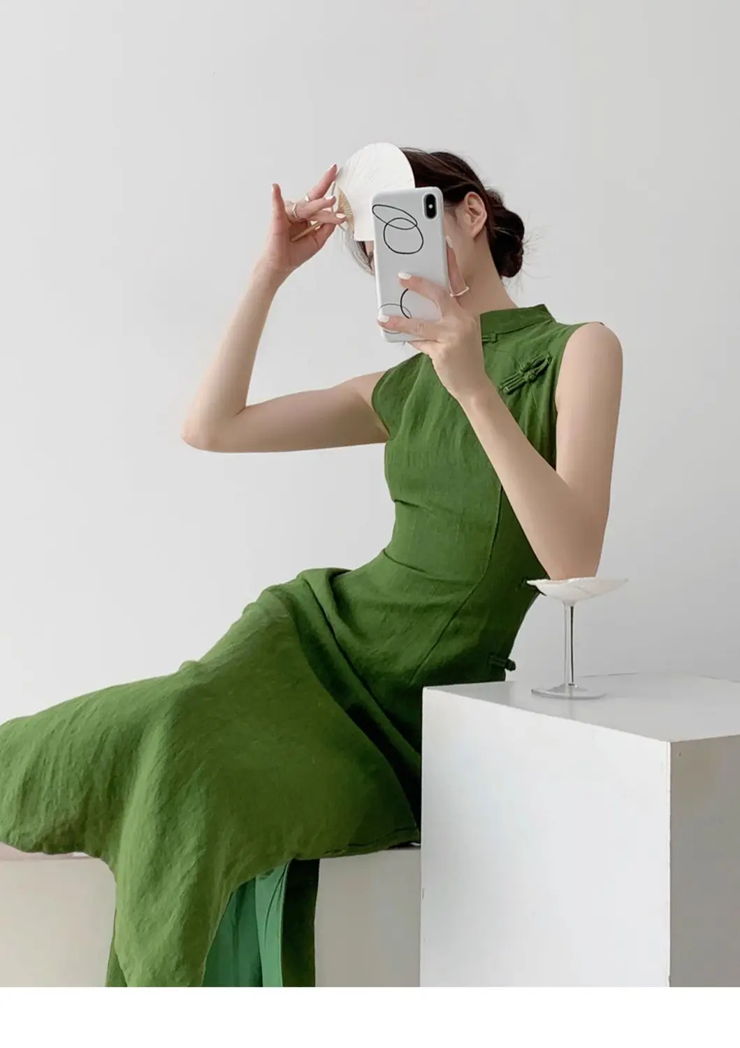 2025 vintage natural literature art dress chinese style daily improved leisure qipao sexy sleeveless waist cinching slit qipao