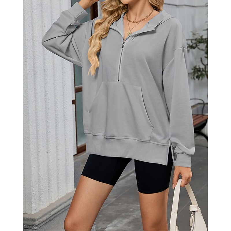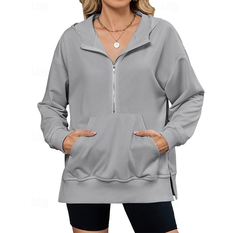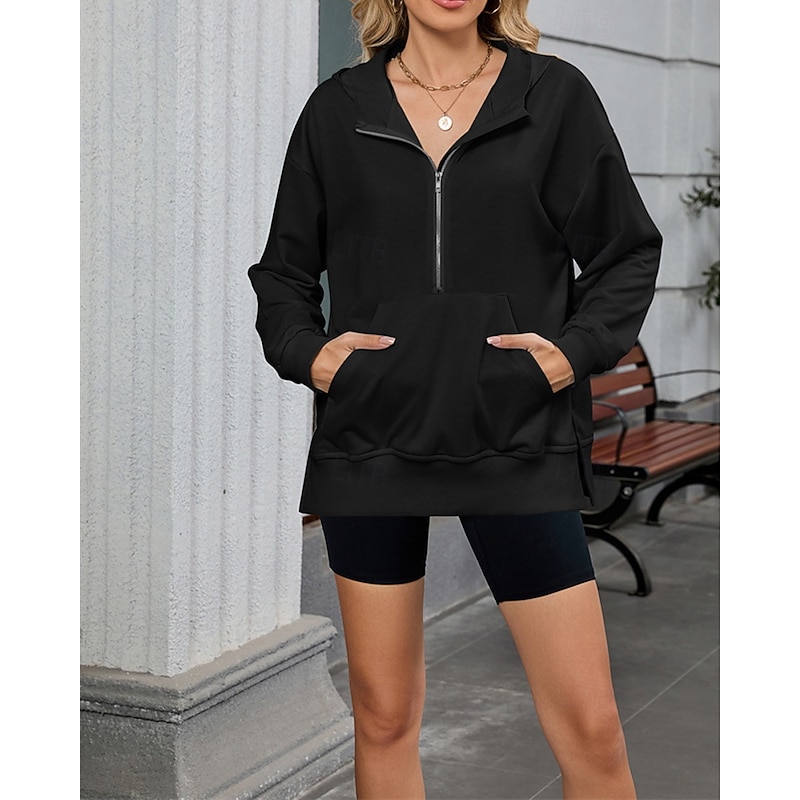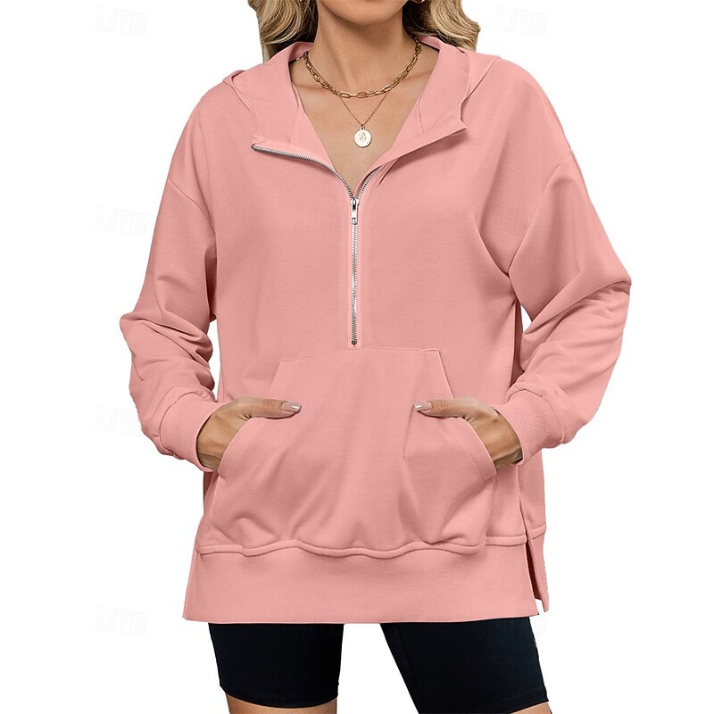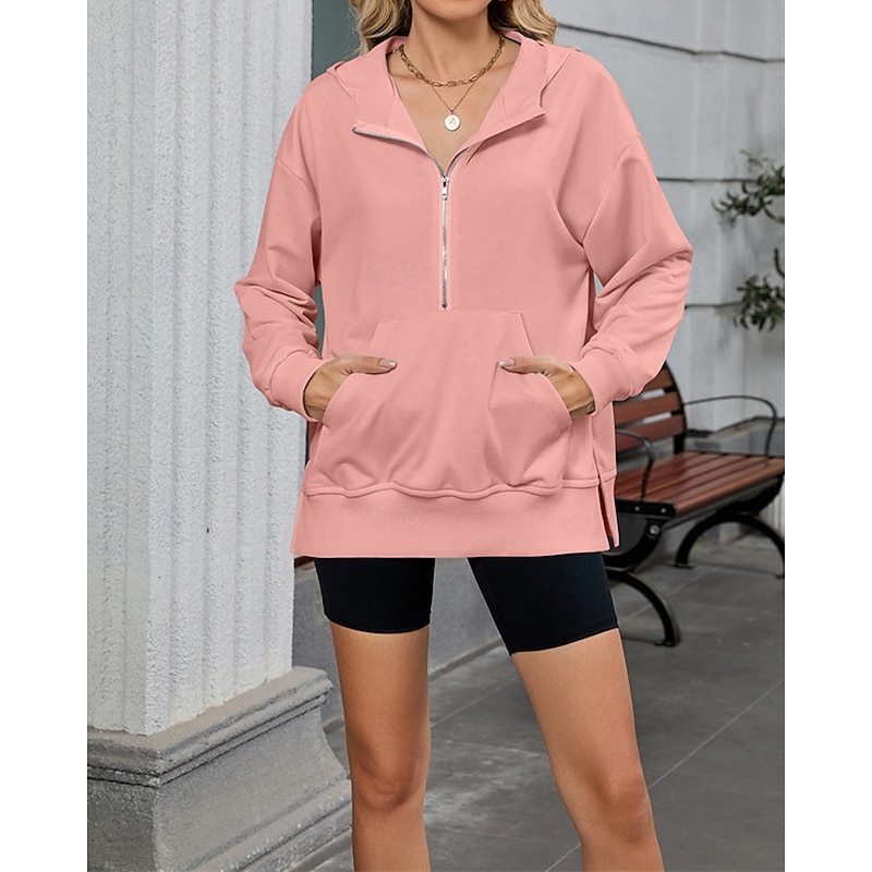 More information about Women's Pullover Hoodie Sweatshirt Plain Streetwear Casual Comfy Long Sleeve Hooded Regular Tops Street Holiday Going out Half Zipper Quarter Zipper Front Pocket Quarter Zip Black Pink Blue Khaki Gray