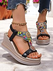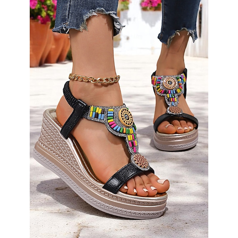 HOT ! Women's Metallic Wedge Sandals with Colorful Boho Beads – Ethnic Platform Sandals for Summer Beach Vacations, Festivals, and Casual Outings