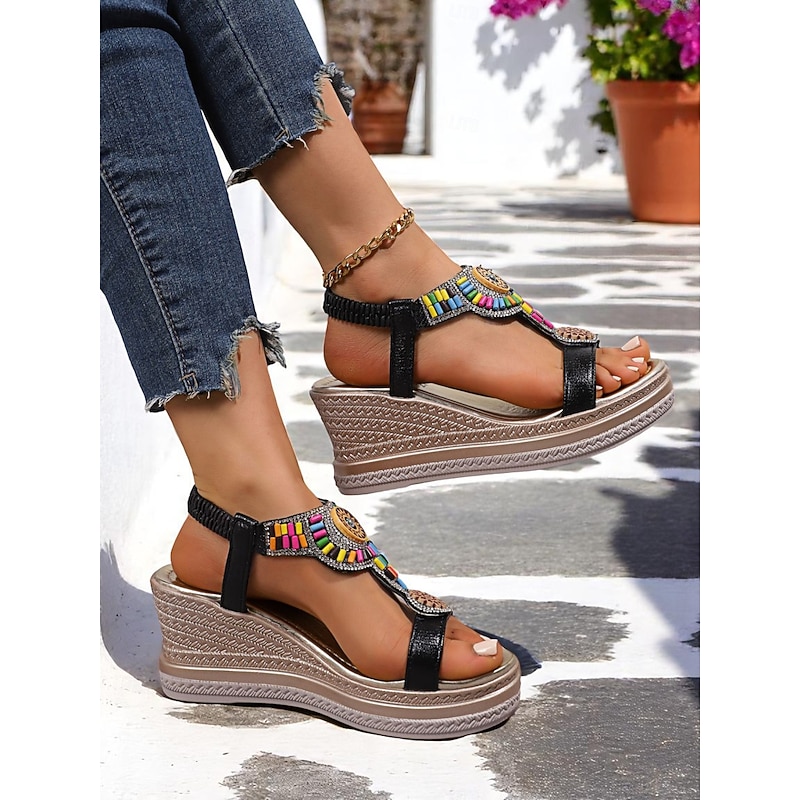 Women's Metallic Wedge Sandals with Colorful Boho Beads – Ethnic Platform Sandals for Summer Beach Vacations, Festivals, and Casual Outings 1