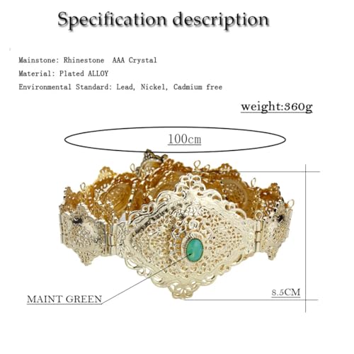 • Material: Made of alloy and rhinestone. Hand Carved Technology, Will Not Easy To Fade, Rust, Discolor, Corrode, Maintain Gloss. This Moroccan Caftan belt is the perfect accessory that will complement any look.