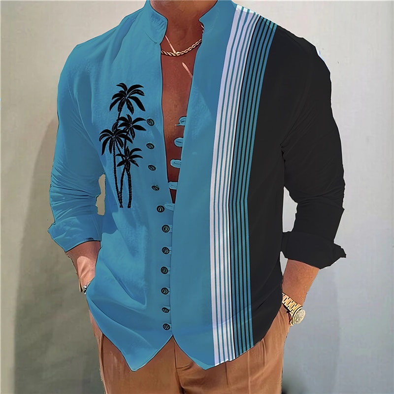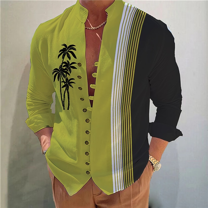 More information about Men's Coconut Tree Striped Tropical Plants Shirt Summer Hawaiian Shirt Aloha Shirt Long Sleeve Shirt Stand Collar Fashion Streetwear Designer Outdoor Street Casual Light Green Light Brown Blue S M L