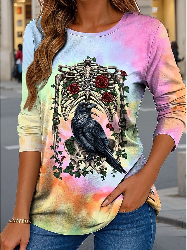 HOT ! By Sarah Richter Halloween Women's T Shirt Skulls Crew Neck Long Sleeve Tunic Graphic Tie Dye Vintage Stylish Classic Regular Tops Daily Print Pink Purple Green Fall
