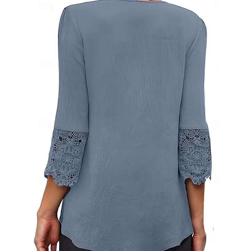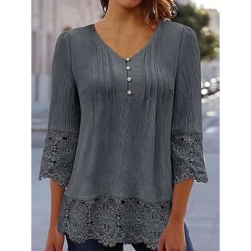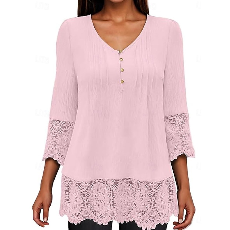 Highlights [Fabric] Crafted from light and breathable polyester, this tunic ensures comfortable wear through spring, summer, and fall. The fabric’s inelastic nature provides a polished appearance while maintaining its elegant drape. [Fit] Featuring a loose fit, this tunic is designed for both comfort and style, making it an excellent choice for a relaxed yet fashionable look. The regular length adds versatility to its appeal. [Design Highlights] The blouse boasts a classic V-neckline highlighted by a row of decorative buttons, adding a touch of sophistication. Three-quarter length sleeves with intricate lace detailing provide a charming boho-chic vibe. The hem is also accentuated with lace trim for a romantic finish. [Occasions] Ideal for daily outings or casual gatherings, this stylish tunic is versatile enough for both relaxed and dressier occasions. Its chic and effortless design makes it a must-have staple in any wardrobe. [Size Range] Available in a range of sizes from S to 2XL, this blouse offers flexible fitting options to suit different body types and style preferences. Choose from various colors including Gray, Blue, White, and Pink.