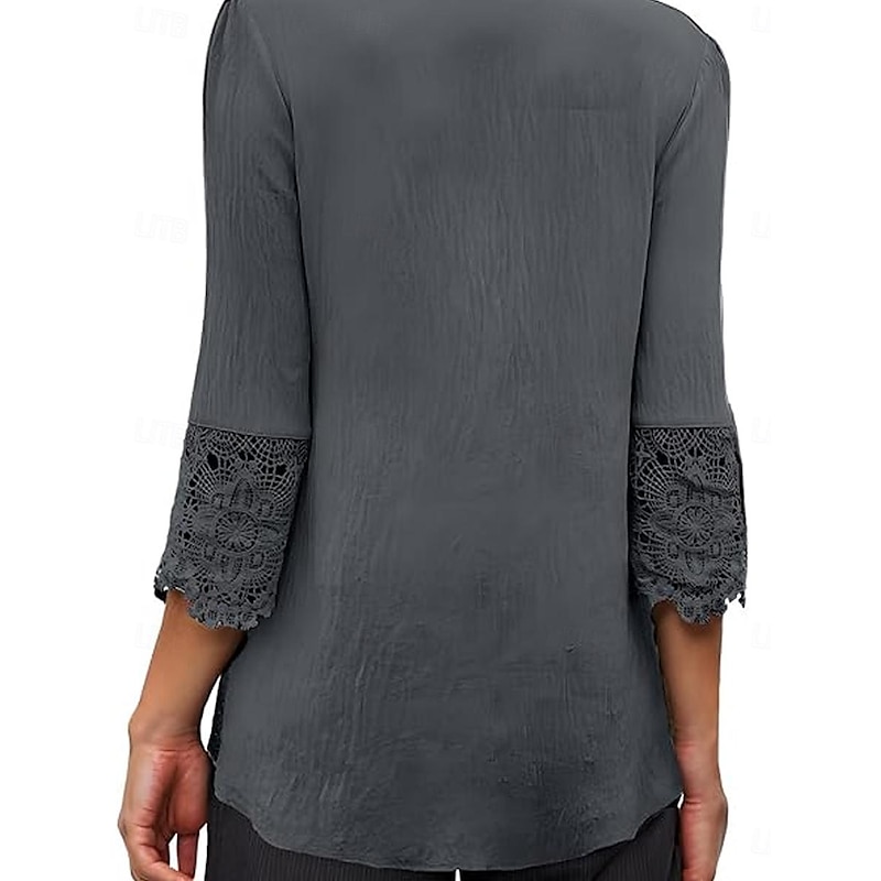 Women's White Elegant Lace Tops Eyelet Blouse Stylish Casual Solid Color Lace Buttons 3 4 Length Sleeve Regular Tops V Neck Daily Romantic Petite Tops Summer Holiday Wear White Pink Blue Gray Spring 15