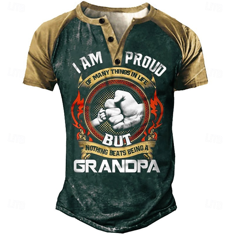 : This piece features a striking color block pattern with a bold graphic print of two fists bumping, symbolizing strength and unity, perfect for those who take pride in their family. The henley neckline with a short button-down placket adds a touch of uniqueness and casual charm to the design.