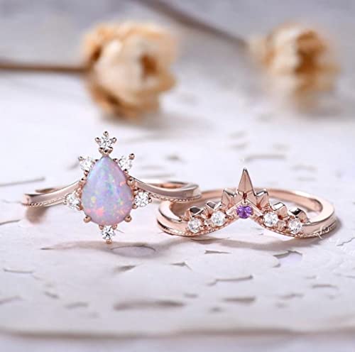 Unique Pear Opal Engagement Ring Set Vintage Teardrop Fire Opal Wedding Bridal Set Dainty Women Ring Art Deco Promise Ring Sterling Silver 5