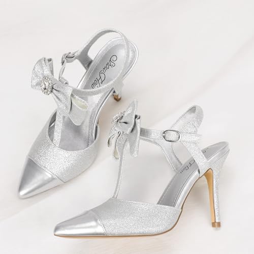 Mofri ShowHow Womens High Heels Closed Splicing Pointed Toe Stiletto Bow Tie Slingback Heeled Shoes Ankle Strap Wedding Pumps Bridal Party Work Dress Shoes 5