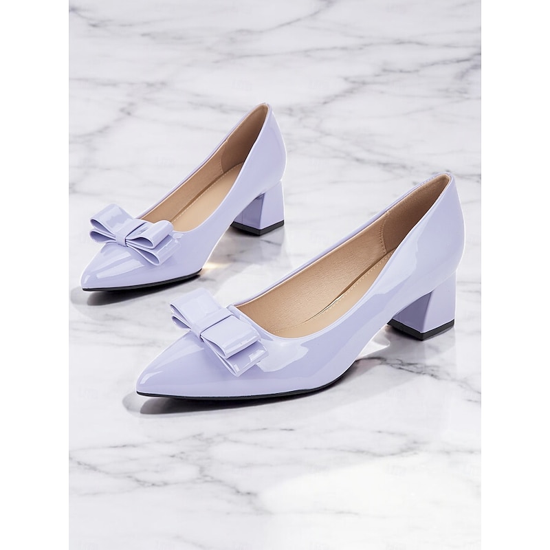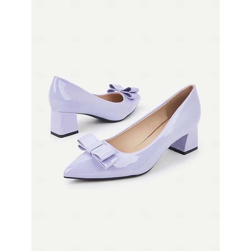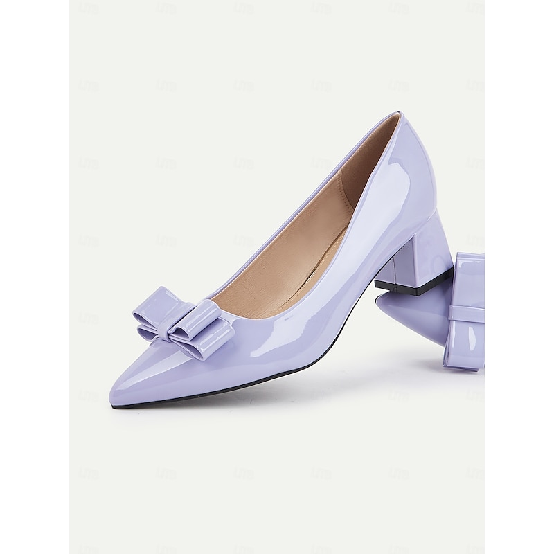 Highlights [Fabric] : Crafted from high-quality PU with a glossy patent leather finish, the shoes have a luxurious sheen that complements their elegant design. The soft lavender hue is perfect for adding a chic touch to any outfit, whether formal or casual. [Fit] : These pumps feature a pointed toe and a block heel, designed to offer optimal comfort and stability for all-day wear. The interior is lined with smooth synthetic leather, ensuring a comfortable and snug fit. [Design Highlights] : The standout feature of these pumps is the stylish bowknot embellishment adorning the top, which adds a playful yet refined element to the sleek design. The chunky heel provides a modern touch, while maintaining a classic and sophisticated silhouette. [Occasions] : Ideal for both formal and casual settings, these shoes can effortlessly transition from an office environment to evening parties or other special occasions. Their versatile style makes them a must-have addition to any wardrobe, suitable for daily wear as well as festive events. [Size Notice] : Available in sizes ranging from US6 to US10.5, it's recommended to select your usual size as they fit true to standard sizing. These pumps offer a perfect blend of style and comfort, making them a reliable choice for various occasions throughout the spring, summer, and fall seasons.