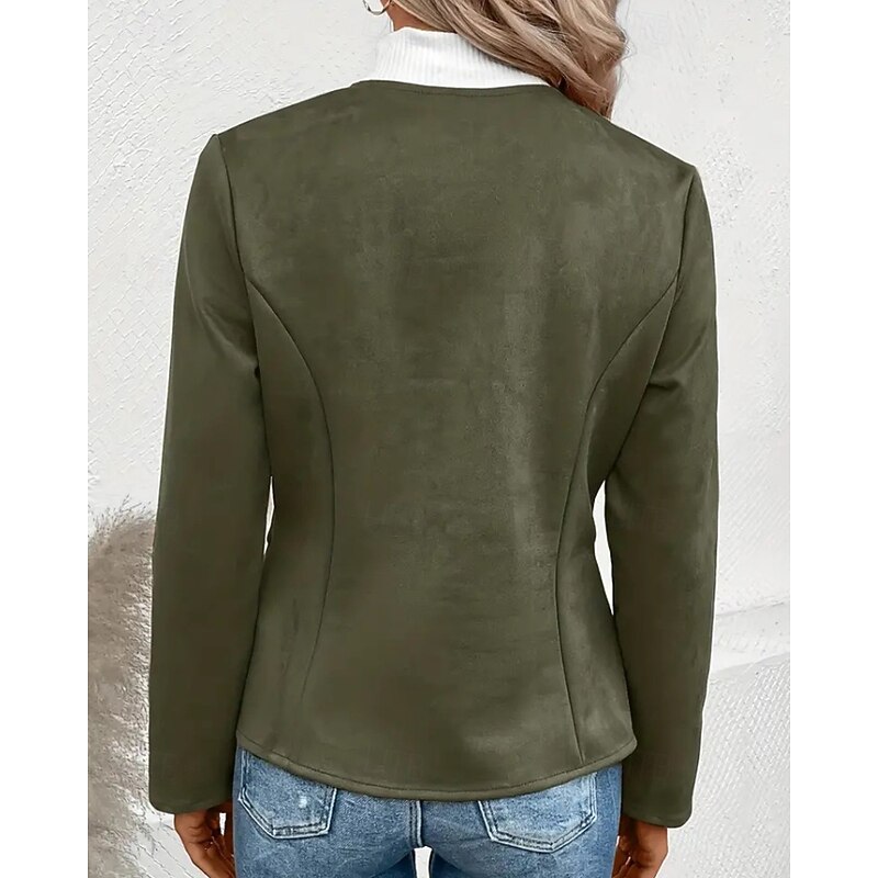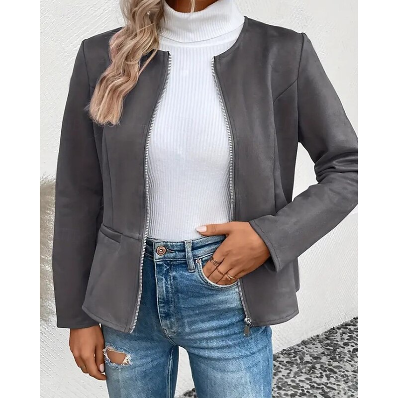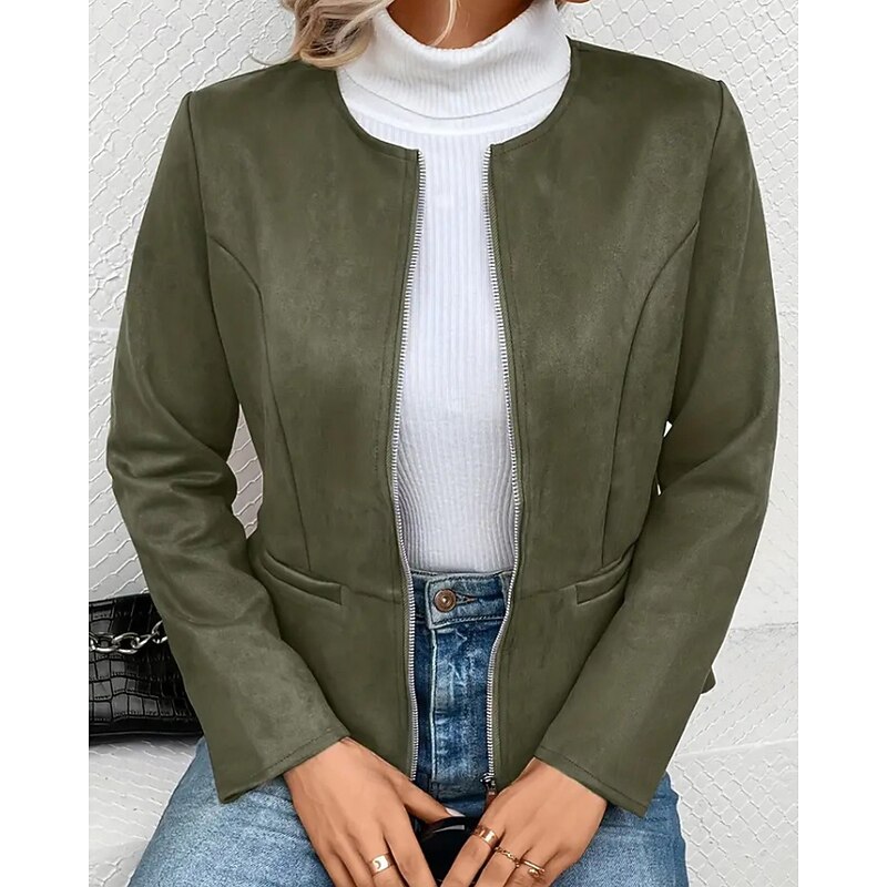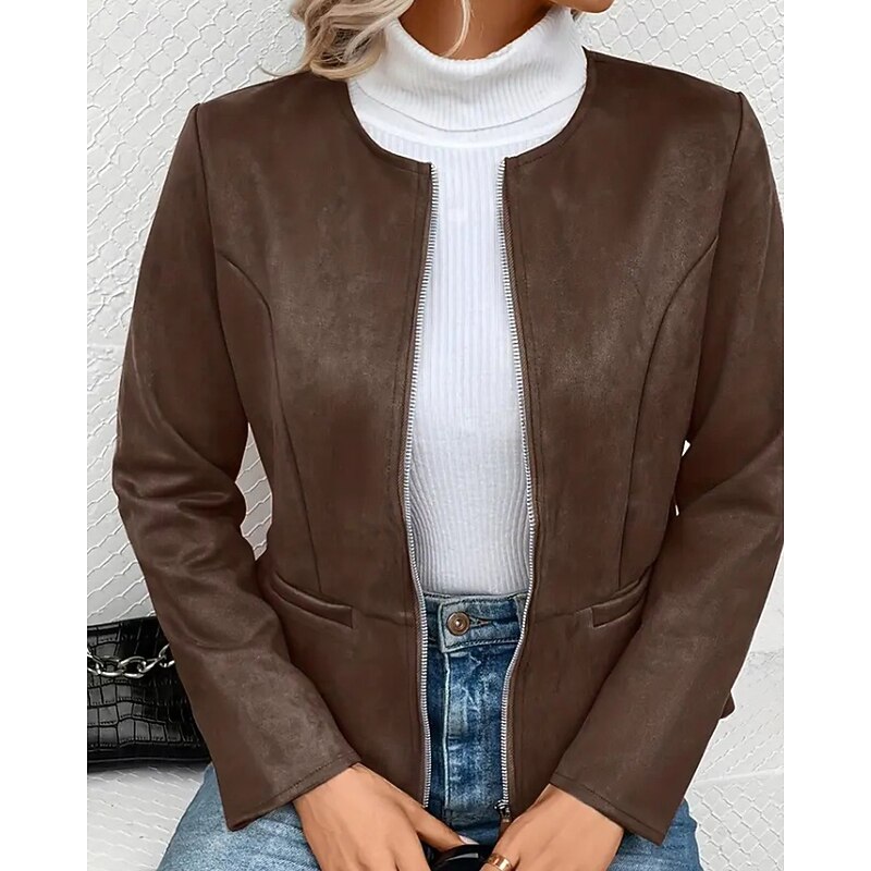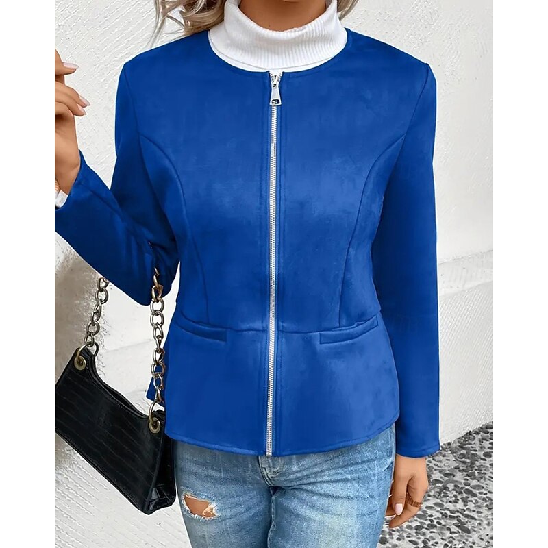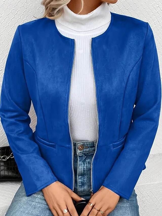 Women's Faux Leather Jacket Casual Jacket Warm Comfortable Zipper Pocket Fashion Plain Outdoor Street Going out Casual Daily Zipper Regular Crewneck Regular Fit Long Sleeve Outerwear Black Blue Dark 10
