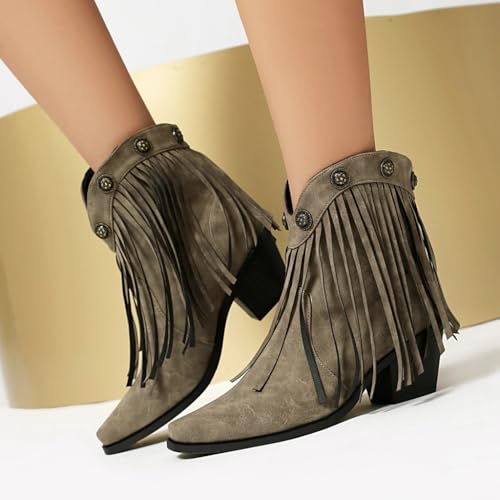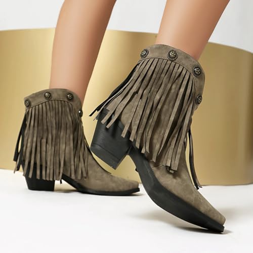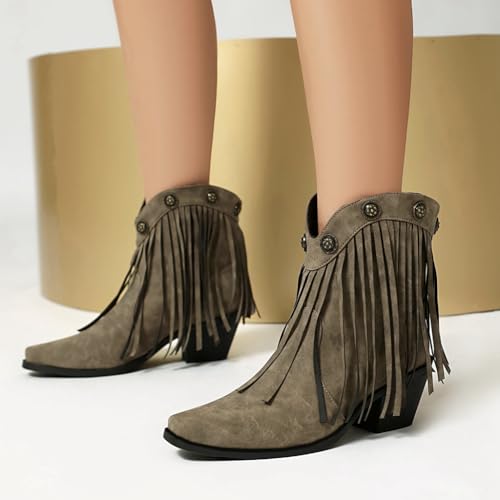 Women's Western Fringed Cowboy Ankle Boots Retro Square Toe Chunky Heels Tassels Cowgirl Short Booties 5
