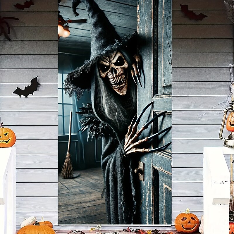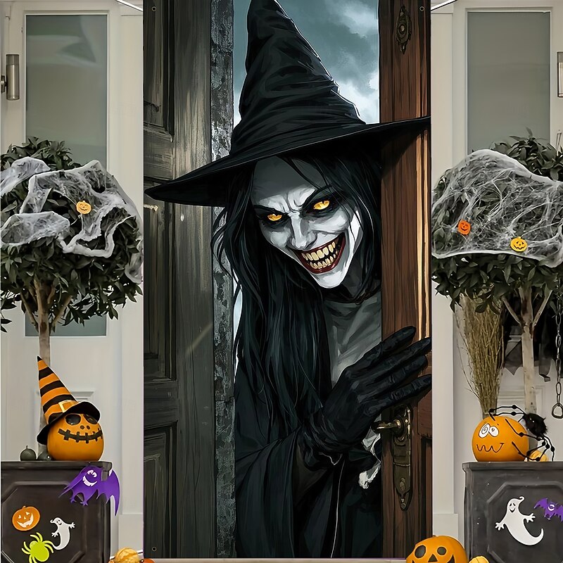 HOT ! Halloween Door Cover – Evil Grinning Witch with Jack-o'-Lanterns, Haunted House Entrance Banner, Scary Outdoor 2025 Halloween Decoration for Bedroom, Living Room, Bathroom