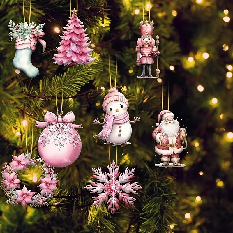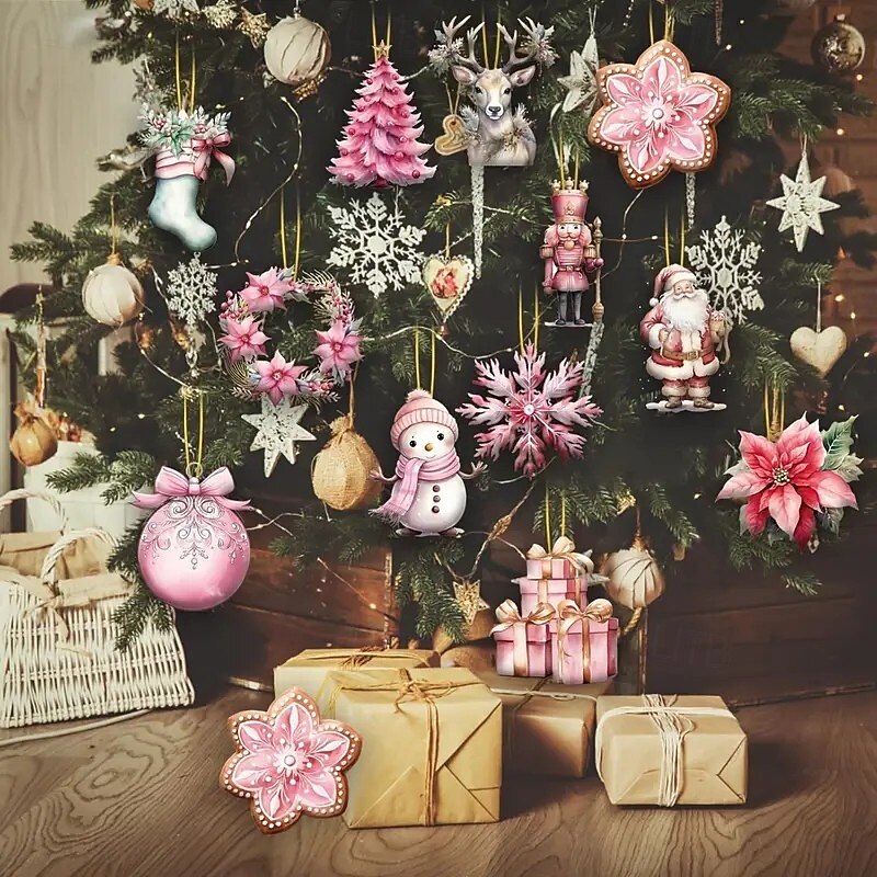 HOT ! 24pcs Christmas Wooden Pink Ornaments, Modern Love-Themed Pink Hanging Decorations for Xmas Trees, Perfect for Home Decor