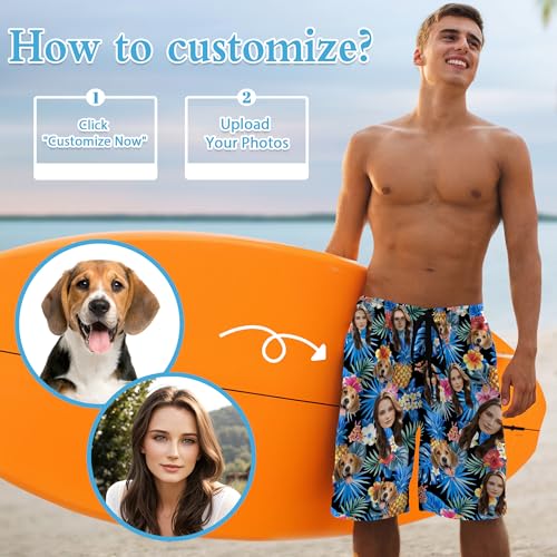 • {Customizable Swim Trunks}: 1.Select size and pattern you want. 2.Click "CUSTOMIZE NOW" button and then click "UPLOAD YOUR IMAGE" button. Upload photo of your Pet or Person,our designer will crop the face onto the swim trunks shorts for the best effect. You'll get a unique customization swim trunks shorts for men.