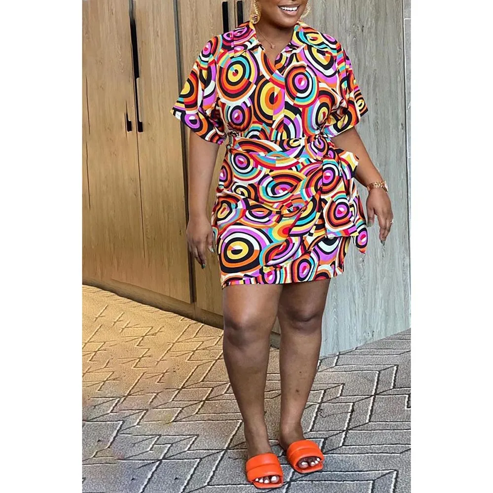 Plus Size Print Short Sleeves Lapel Wrap Dress