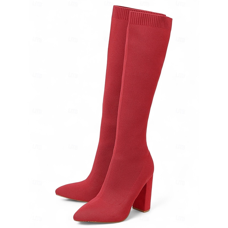 HOT ! Women's Red Knee-High Sock Boots - Stretch Knit Pointed Toe Chunky Heel Long Boots for Fashionable Fall Winter Outfits, Parties and Streetwear Looks