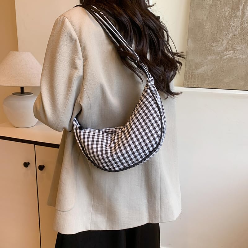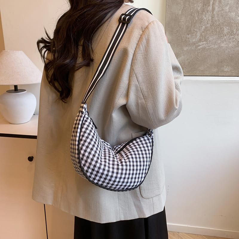 HOT ! Checkered Nylon Crossbody Bags Crescent Bag Plaid Lightweight Sling Moon Purse for Women