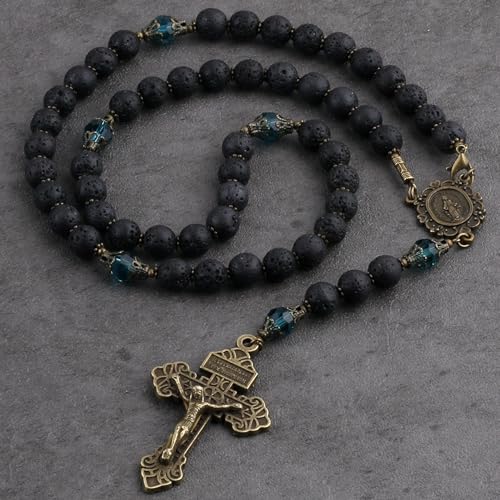 HanlinCC 8mm Lava Stone Beads Catholic Rosary Necklace with Virgin Mary Medal and Pardon Crucifix 1