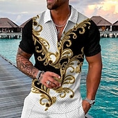 Highlights [Fabric] : Crafted from a lightweight and breathable blend of polyester and cotton, this men's shirt offers comfort and easy maintenance, making it an ideal choice for warm weather. [Fit] : Designed with a slim fit, this polo shirt accentuates the wearer's physique, combining style and comfort effortlessly. [Design Highlights] : The shirt showcases a bold, two-tone color scheme with striking black and gray sections, adorned with intricate golden baroque-style patterns. The classic collar features a quarter zip polo with 3D print design, enhancing its contemporary appeal. [Occasions] : Perfect for summer outings, beach parties, or casual gatherings, this vintage-inspired, casual shirt provides versatility and a fashion-forward look suitable for a variety of events. [Size Information] : Available in a wide range of sizes from S to 5XL, this shirt caters to different body types, ensuring a great fit for all.