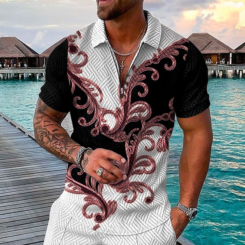 Men's Baroque Zip Polo Shirts Golf Shirt Short Sleeve Polo Shirts Collared Shirts Vintage Casual Vacation Wear Party Outfits 3D Print Quarter Zip Polo Black / Gray Black Pink 8