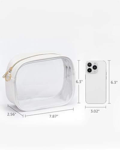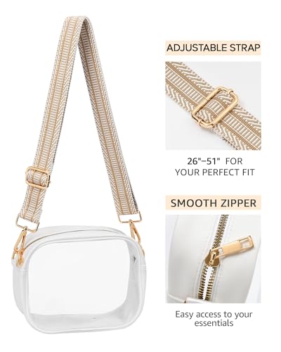 • Fashion-Forward and Functional: With minimalist white body and stylish patterned strap and shiny gold-tone hardware, this small clear purse elevates your concert outfit effortlessly. A smooth zipper adds ease, making it an easy match for modern, on-the-go lifestyles