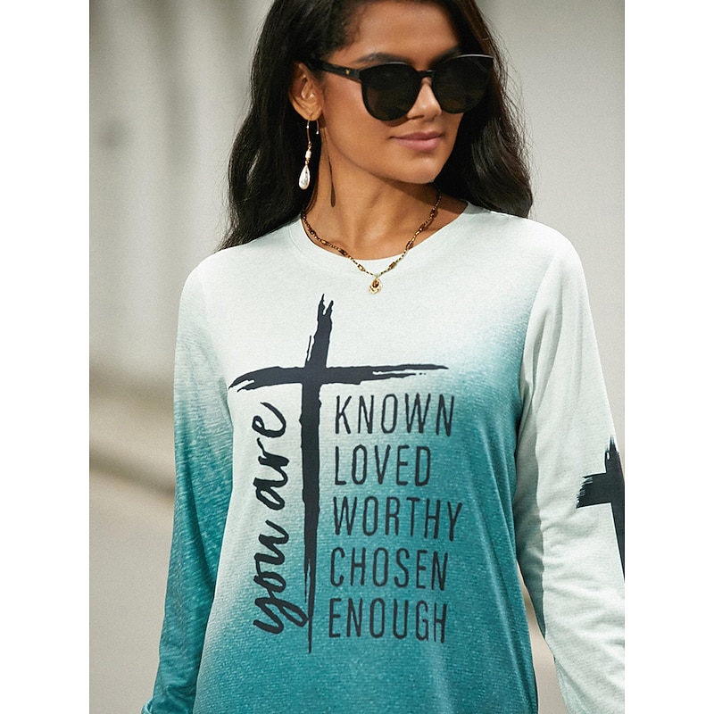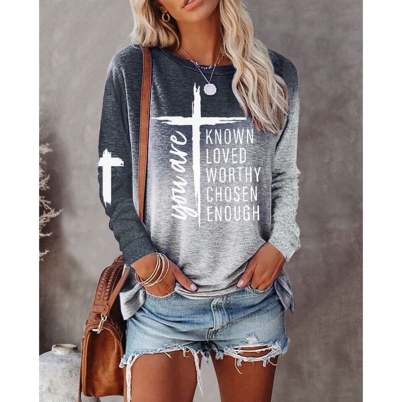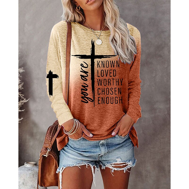 More information about Women's T shirt Crew Neck Long Sleeve Tunic Basic Print Regular Tops Round Neck Daily Weekend Orange Green Gray Spring & Fall Fall & Winter you are KNOWN LOVED WORTHY CHOSEN ENOUGH