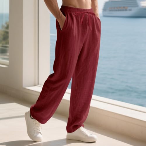 HOT ! Mens Linen Pants Elastic Waist Drawstring Loose Fit Beach Lounge Trouser Solid Color Casual Lightweight Baggy Pants