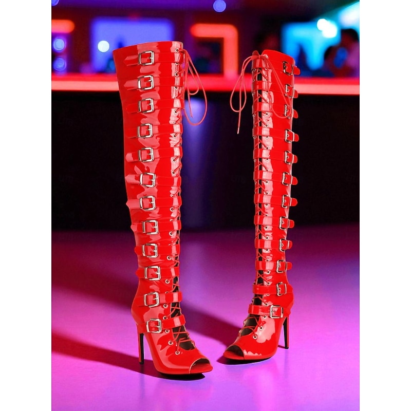Women's White Thigh High Buckle Boots - Sexy Peep Toe Stiletto Heel Party Boots for Ladies, Gothic Punk Fashion Footwear for Nightclub, Stage Performance and Festival Outfits 14