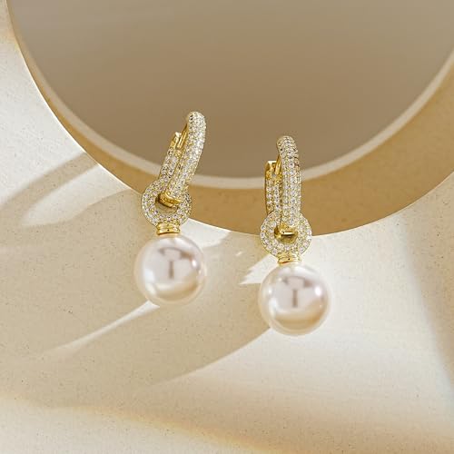 Pearl Earrings for Women, 14K Gold Plated Pearl Drop Dangle Earrings Zircon Pearl Stud Earrings Trendy Hypoallergenic Wedding Gold Hoop Earrings for Women Bridesmaid Jewelry Gift 6