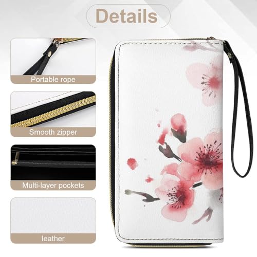 HOT ! Watercolor Pink Cherry Florals Leather Wallet Smooth Zip Around Clutch Wristlet Travel Long Soft Purse for Women