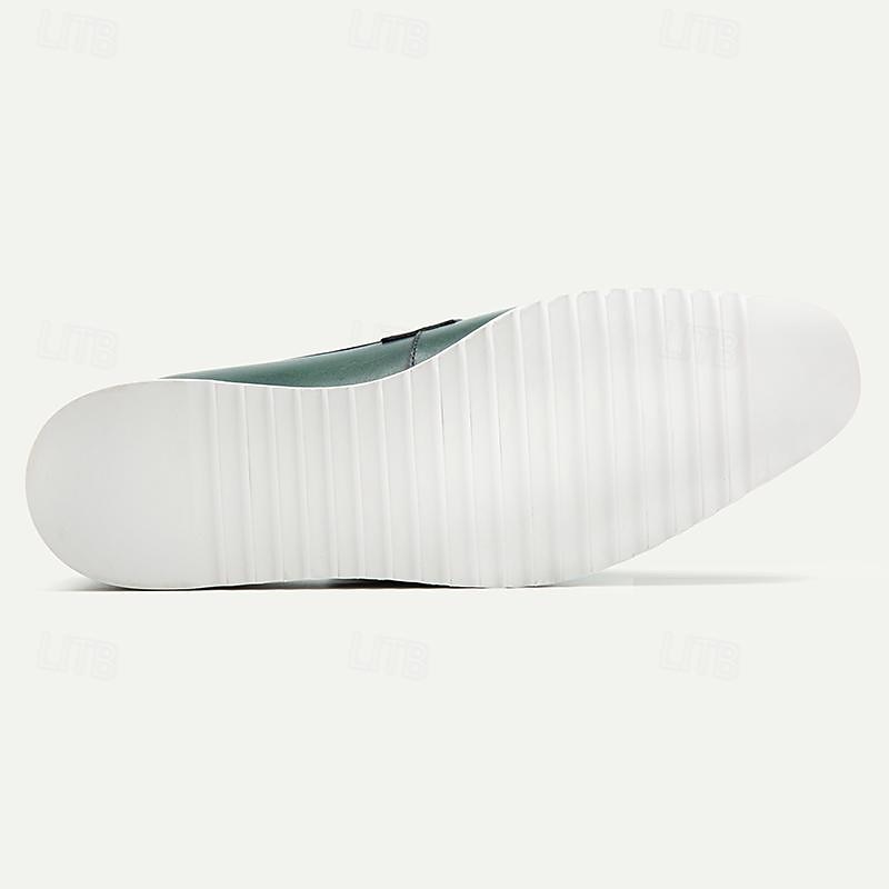 HOT ! Men's Green Leather Loafers - Stylish Slip-On Dress Shoes with Metal Buckle Detail and White Sole for Business, Formal Events, and Casual Outings