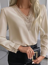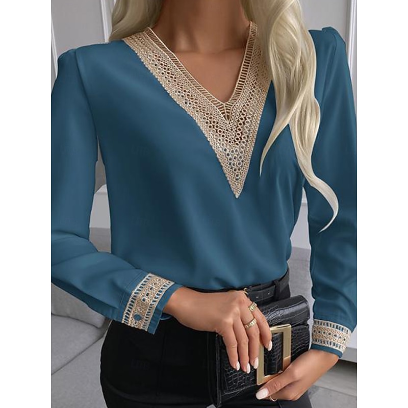 Highlights [Fabric] : Crafted from high-quality polyester, this women's blouse offers a silky, smooth texture that exudes a luxurious appearance, perfect for the transitional seasons of spring, fall, and winter. The fabric is inelastic, providing a sleek and polished look. [Fit] : This blouse features a modern, stylish silhouette with a form-fitting design that flatters the body's contours. It combines comfort with elegance, making it suitable for both formal and casual occasions. [Design Highlights] : The blouse boasts a sophisticated V-neckline, enhanced with delicate lace trim that contrasts beautifully for added elegance. The long sleeves are adorned with intricate lace detailing at the cuffs, further emphasizing its feminine appeal. [Occasions] : Ideal for work environments or formal settings, this blouse pairs seamlessly with a pencil skirt or tailored pants, making it a versatile choice for office wear or an evening out. [Size Range] : Available in sizes M, L, and XL, catering to a variety of body types and ensuring a perfect fit for everyone. With color options in Blue, White, Black, and Khaki, this blouse fits seamlessly into any wardrobe.